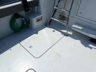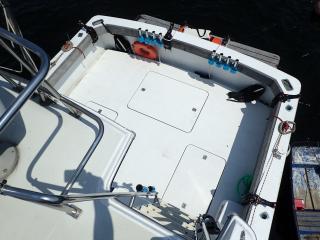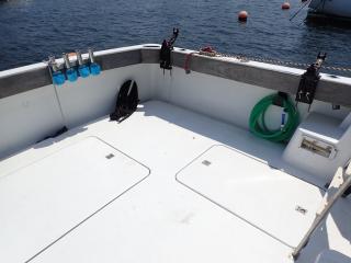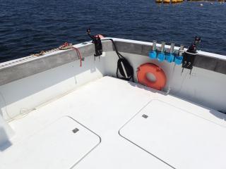 ●アフトデッキはかなり広いスペースが確保されています。カジキ釣り用にも適している船ですので、ロッドホルダーも何カ所に設置されています。