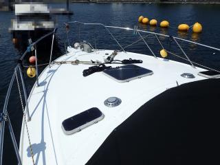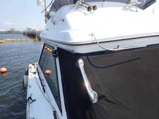 ●船全体に塗装が行われています。特にハルのマット塗装は、落ち着いた色ではありますが、存在感や重圧感を感じました。また、スイミングステップ周辺や塗装の剥がれは見受けられました。