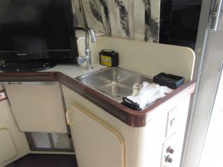 センターキャビンを進んで階段を降りたところには、ギャレーがあります。ギャレーにはシンクや冷蔵庫、電子レンジ、電気コンロなどが装備されています。