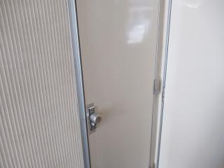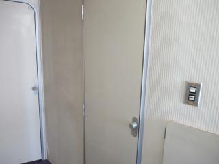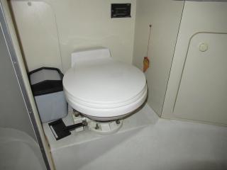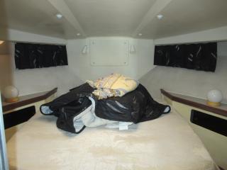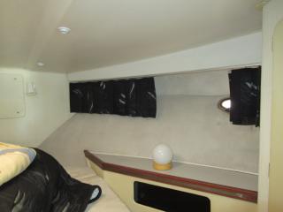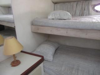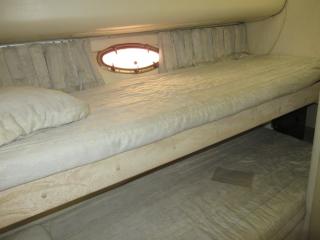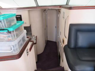階段を降りて右舷側にはゲストルームがあります。ゲストルームには2段ベッドの装備があります。左舷側にはトイレとシャワールームがあります。
