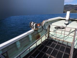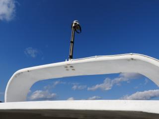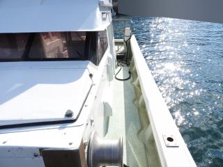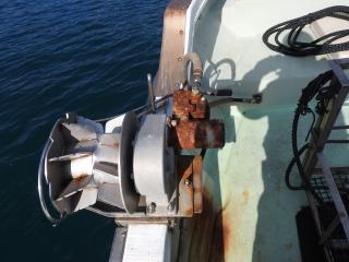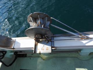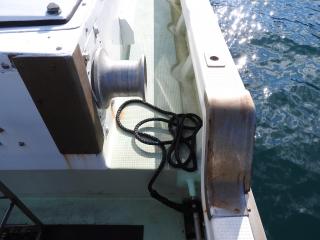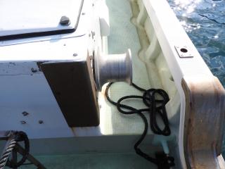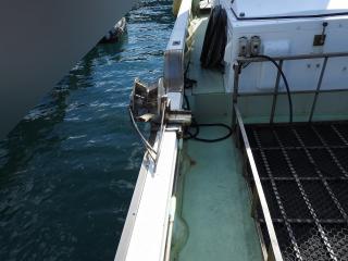 ◆左舷サイドに油圧式のアンカーローラーがあります。