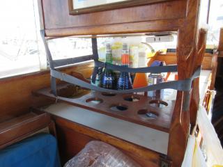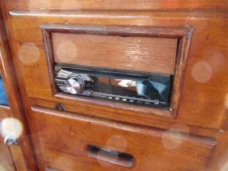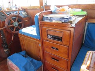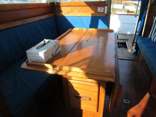 まず入口を入るとまずセンターキャビンになります。中央にはテーブルが装備されており、両舷にソファーがあります。右舷側ソファーの前方がLSの操船席になります。センターキャビンにはエアコンやステレオなどの装備があります。