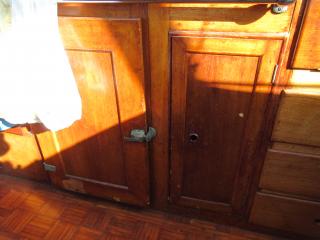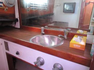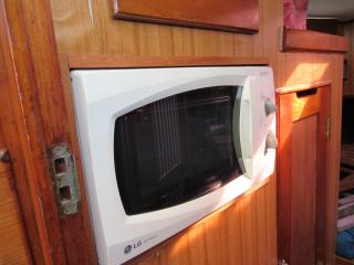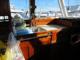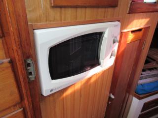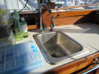 左舷側前方にはギャレーがあります。ギャレーにはシンク、電子レンジなどが装備されています。