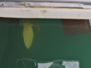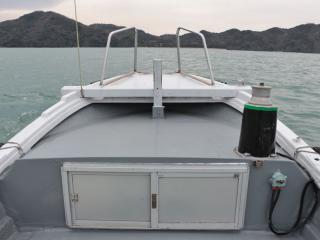 ◆船底両舷にはローリングチョッパー(揺れ止め)が付いています。なお、試乗時にはややうねりがありましたが、横揺れは2.5mの船幅にしては小さく感じました(当方主観)