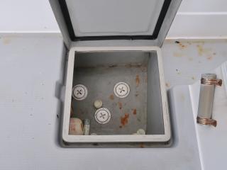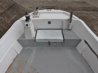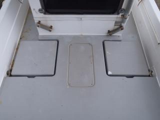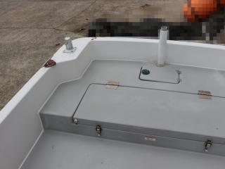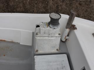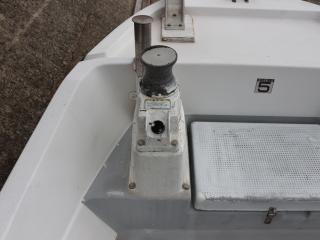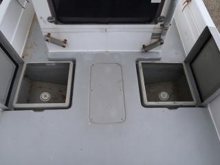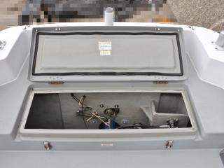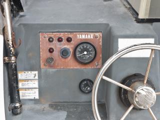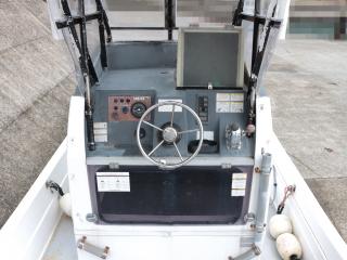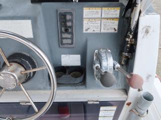 ◆ヘルムハンドルが中央にあり、エンジンリモコンは右にあります。またダッシュボードには魚探を入れられるボックスがついています。なお、魚探は付属していませんが、ホンデックス製の振動子は船底に付けたままとの事です。