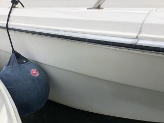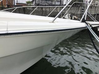 ○デッキの状態などは、大きな破損箇所はないようで、通常使用時に付いた軽微なキズやスレはあります。割れやひどい箇所はありません。年式の割に良い状態と思います。デッキの形状がセミウォークアラウンド艇ですので、バウ側への移動もし易く、釣行に海水浴にマルチに使えるクルーザー艇です。