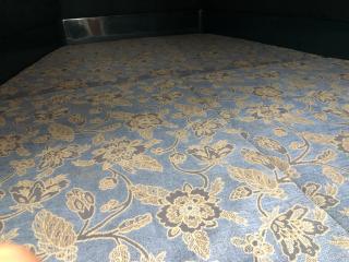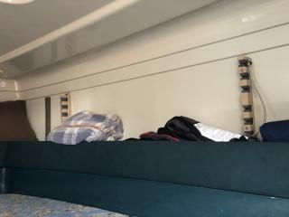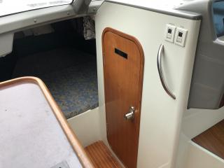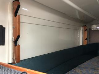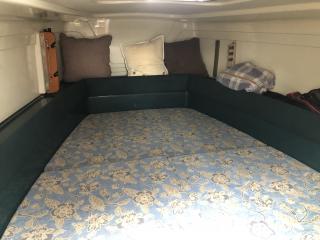 ○前方にはバウキャビンがあり大人2人がゆったりと横になることが出来ます。天井や壁もきれいです。クッションは年式の割にきれいな状態です。