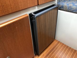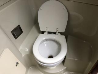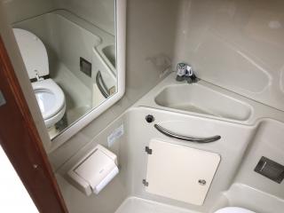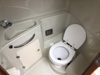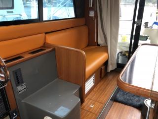 ○入口から入るとまずセンターキャビンになります。テーブルを中央にして左右にソファーがあります。また、電動式マリントイレの装備もあります。