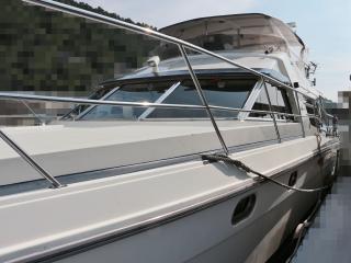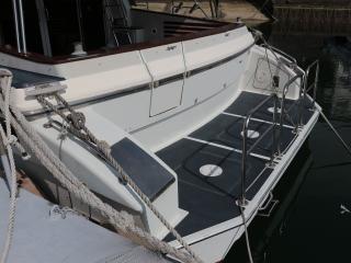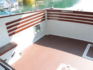 ◆取材時の船齢は30歳を越えている個体ですが、係留されている環境が良い事と丁寧に乗られている事もあってか傷も少なく、綺麗な個体だと感じました。船体は実長約17m、実幅約4.5mのサロンクルーザーですが、オーナー様は釣りがご趣味という事もあって釣りの事も考えられた仕様になっています。