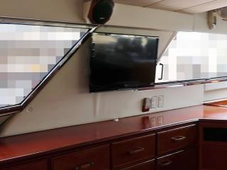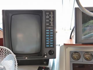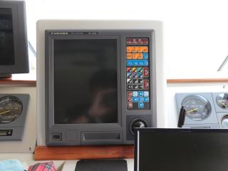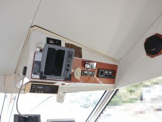 ◆コクピットにはプロッター、魚探、レーダー、ソナー、オートパイロットなどの装備が整っています。(レーダーは旧スプリアスの可能性あり)また、エンジンの様子を常時監視できるモニター2台も備わっています。なお、写真にはソナーモニターが写っていますが、この艇のソナーは振動子の取り付け位置に安全性が担保されていないとJCIに判断され、取り外さざるを得なくなりました。
