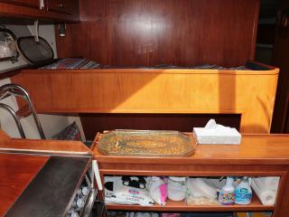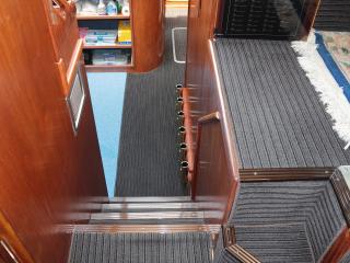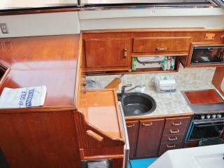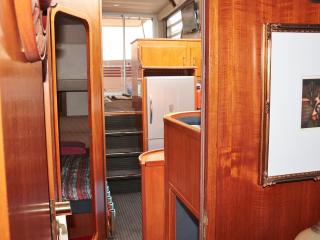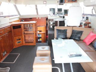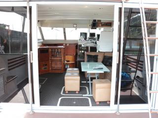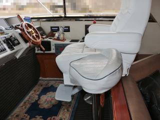 ◆メインコクピットは右舷側にあり、後方のサロンよりは一段高くなっていますので、船内サロン、キッチンが見渡せ、また船体全周に渡って見切りが良い設計になっています。
