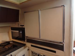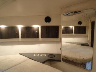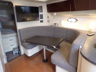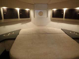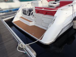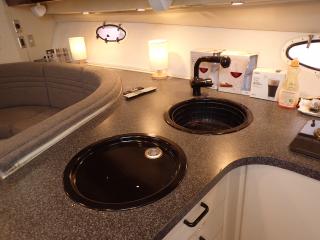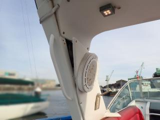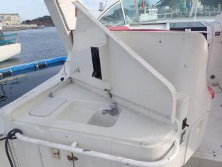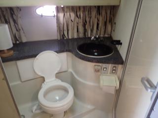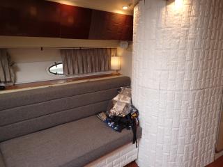 ○船内の造りは船内入りますと左舷側にはソファーの装備があり、右舷側にはギャレーがあります。ギャレーにはシンク、電子レンジ、電気コンロ、大型冷蔵庫等の装備があります。キャビン内にはTV、ステレオなどの装備がありギャレーの前方側にも大きなソファーの装備があります。前方に進むとまずバウルームがあり、大人2人が横になれる十分なスペースが確保されています。トイレルームにはシャワー設備もありますので、来船されたゲストの方々にも喜んで頂ける空間がたっぷりと用意されています。