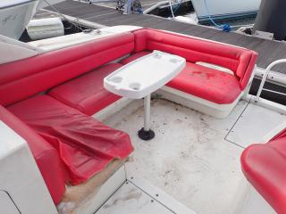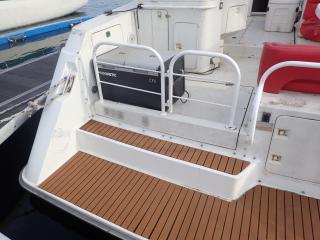 ○アフトデッキはとても広い空間が確保されています。大きなソファーもありますが、一部クッションに剥がれがありました。デッキのレイアウトとしては、船にお招きしたゲストの方々にゆっくりと楽しんで頂ける印象がございました。