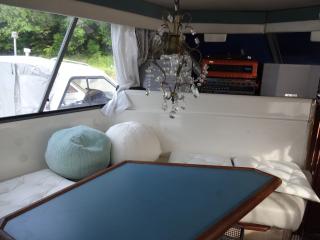 マリーナ停泊中にキャビン内でご友人と語らいながら