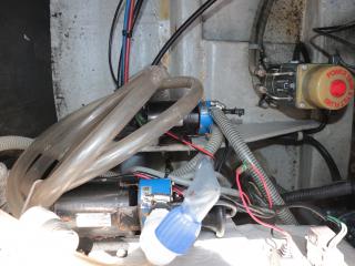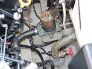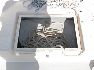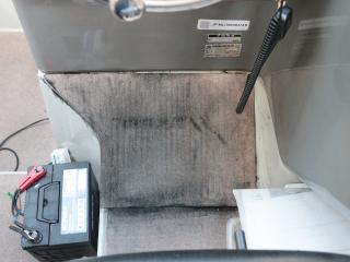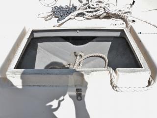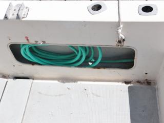 ◆アフトデッキ左舷側ハッチにはメインスイッチやバッテリーが備わっており、右舷側ハッチ内には油圧操舵や海水ポンプ類が備わっています。油圧操舵シリンダーもオイル漏れなどなく良好でした。