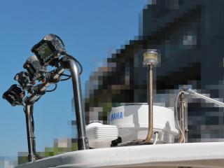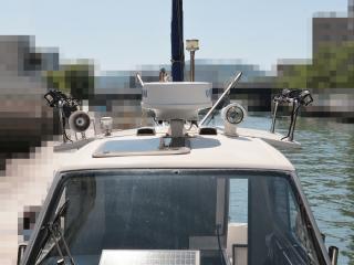 ◆ルーフにはレドームレーダーアンテナ、サーチライト、GPSアンテナ、無線のアンテナ(可倒式)白灯の他、12VのLED集魚灯が両舷に各4灯装備されています。