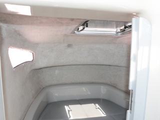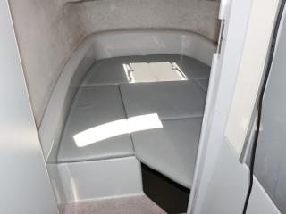 ◆操船部前のVバースは左舷側から入れます。中は大人が2~3人が横になって寝られるほどのスペースがあります。また、Vバースにもスカイライトハッチが装備されており、左右の明り取り窓と相まって中は明るいです。Vバースのクッションパネルの下には電動マリントイレも装備されています。なお、取材時にはモーターが回る事を確認しました。