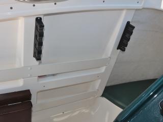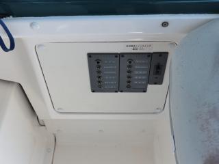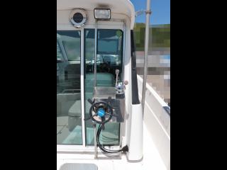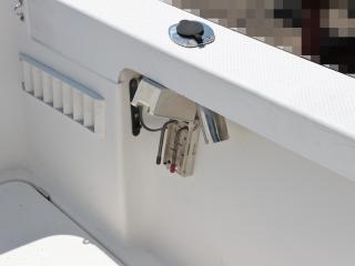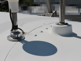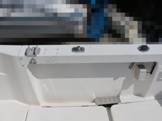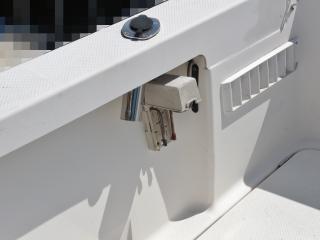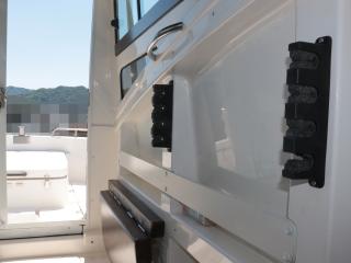 ◆アフトデッキ両舷には電動リール電源も備わっています。また両舷のブルワークには埋め込み式のロッドホルダーと竿受けの台座が付いています。