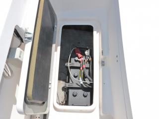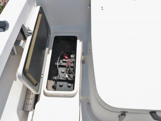 ◆アフトデッキ右舷後方ハッチにはバッテリーが備わっており、右舷前方及び左舷前後のデッキハッチはストレージ(物入れ)として使えます。