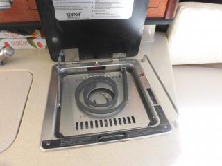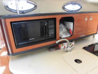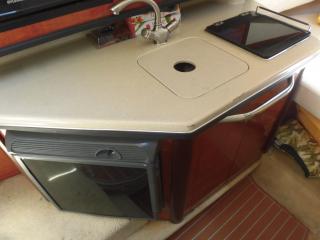 階段を降りて左舷側にはシンク・冷蔵庫・コンロ・電子レンジがあります。