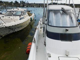 オーナー様は貝の付着を減らすため、係留時、船底をブルーシートで覆っております。