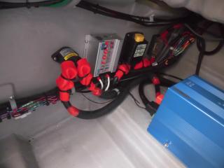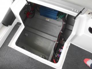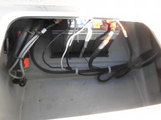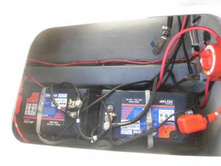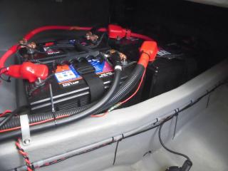 パッセンジャーシート下にはエアコン用にバッテリーが4個ありインバーター(3000W)を介して動かしております。(6個までつなぐ配線がしてあります。)