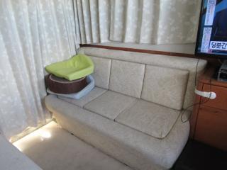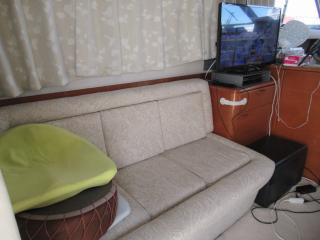 まず入口を入るとまずメインキャビンになります。右舷側にはテーブルと大きなソファーがあります。また、左舷側にもソファーがあります。写真のようにメインキャビンの前方にはTVが装備されています。右舷側がLSの操船席になります。階段を降りると、左舷側にはギャレーがあります。ギャレーには冷蔵庫、シンク、電子レンジや電気コンロなどが装備されています。
