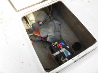 運転席と助手席の間にはスカッパー付イケスとバッテリースペースがございます。