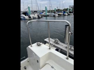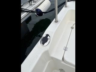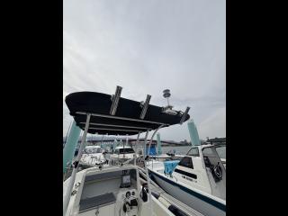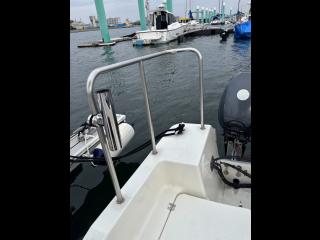 今流行のTトップオーニングにロッドホルダー、バウ側とスタン側に高めのレールが装備されており使いやすい艇です。