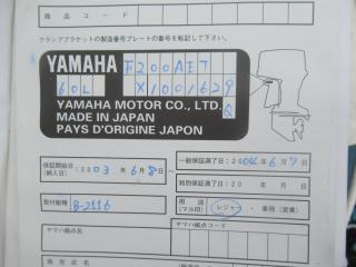 船外機:YAMAHA 200馬力 型式:60L(F200AET):6,000RPM
