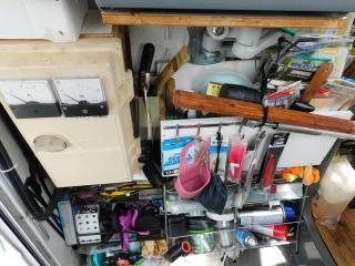 左舷壁面にはタックルなどの小物を収納する棚があります。