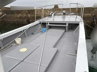 スピードは巡航20ノット位はいけますが、通常はゆっくり18ノット位で走ってます。生簀を開けた状態でもMAX26ノット位は出ます。