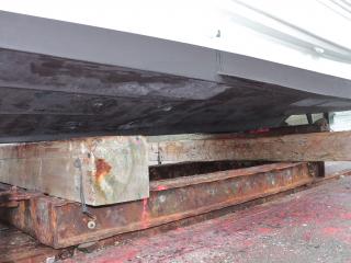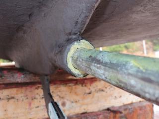 ◆この船は現在係留保管されていますが、取材時は上架状態でしたので船底の写真も撮影できました。なお、シャフトはブラケット保持でシューピース付きです。また、シャフトはSUS630でΦ55mmです。