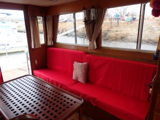 〇船内は中央にはテーブルがあり、それを囲む様に両サイド側がソファーとなっています。エアコンも完備していますので、年間通して快適に過ごせるのではないかと思います。