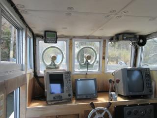 左舷側で油圧式巻き取り機でカゴの」回収ができます。単独でも操業ができるように3連リモコンとアフトモニターもございます。