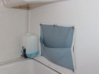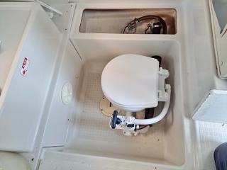 ◆操船部の左舷側からバースに入れます。バースにはパネルが敷いてあり、その下に手動マリントイレが装備されています。手動マリントイレも2026年2月に新品交換されています。