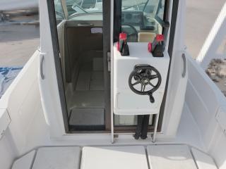 ◆この艇はリアドア付きです。リアドアの右舷側にはセカンドステーションがあり、ここでも操船可能です。微速装置の操作ノブはここについています。