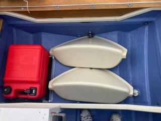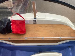 シート下にイケスがあり、トランサムにはスパンカーも取り付けてあります。
