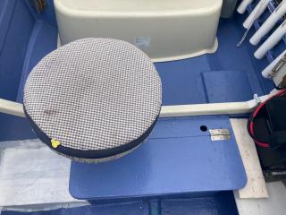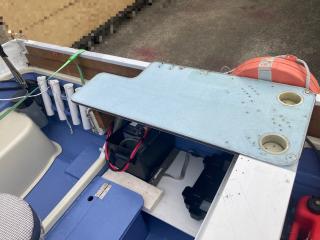 中央にドライバーズシート、左舷側に自作の収納棚が設置しており、操船時やフィッシング時に使い易いものです。