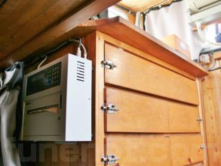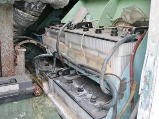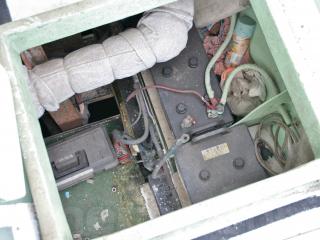 エンジンルームは左舷側から入れます。入り口を開けるとバッテリーが見えます。このバッテリーはおそらく交換が必要だと思います。