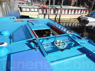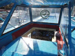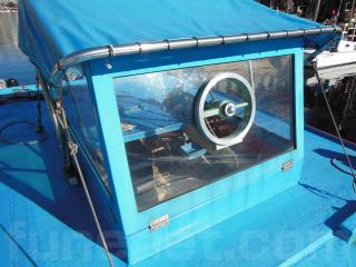 操船席ハウスは写真の通り、寒い日の走行時でも快適な空間になっています。低い橋などを通行する時には上部が写真の通りに可倒式になっています。