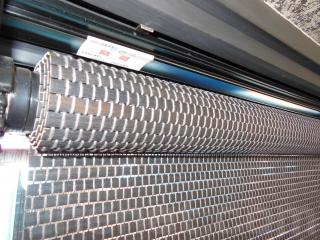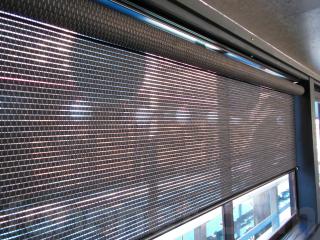 窓には日よけの為にロールカーテンがあります。また、壁側には6個のコンセントとカラオケ用のマイクジャックがあります。