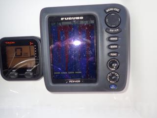 〇操船席には、デジタルタコメーターなどやGPS,魚探(ROYAL RF-8400NFⅢ)や魚探(FURUNO FCV-620)を装備しております。ドライバー正面に設置してあり、見やすく使い勝手も良さそうです。