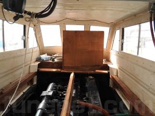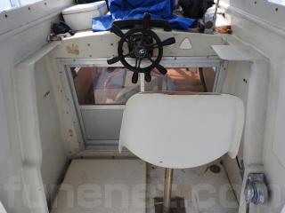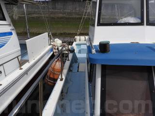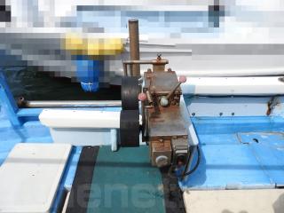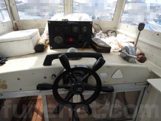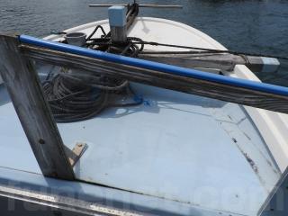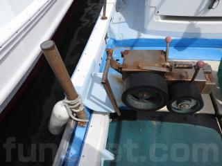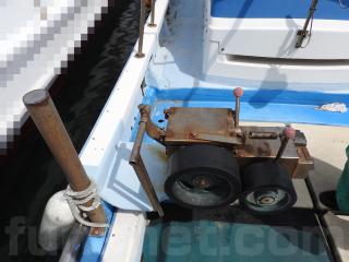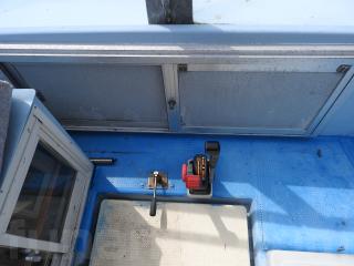 ◆フロントデッキでの釣行をされていました、延縄のローラーを装備されています、手元で操船出来るように、 馬力ハンドル、クラッチハンドル、油圧の舵ハンドルをデッキの前方表面に取り付けています、右舷側のレールを切り取り、仕事の具合が良いように改造しています。