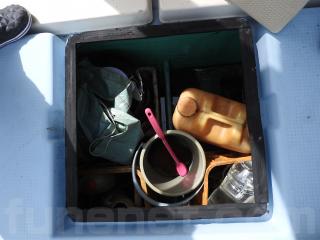 ◆バウに物いれがあります、その上に風避けを付けています、時化のときなどに重宝します。