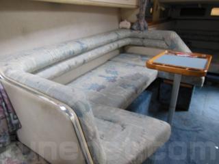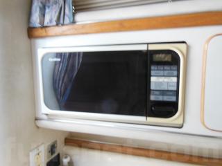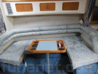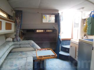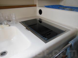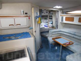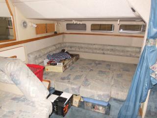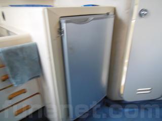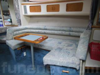 キャビン入口を入るとまず右舷側に大きなソファーとテーブルがあり、とても広い空間が確保されています。左舷側にはギャレーがあります。ギャレーにはシンク、電子レンジ、電気コンロ、冷蔵庫等の装備がされています。また、トイレの設備もあります。キャビン入口の右下にはアフトキャビンがあります。大人2人が横になることが出来る空間が確保されています。