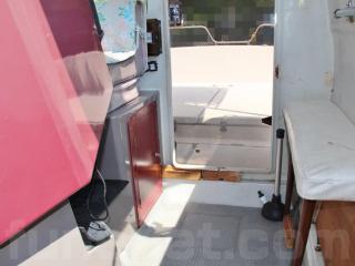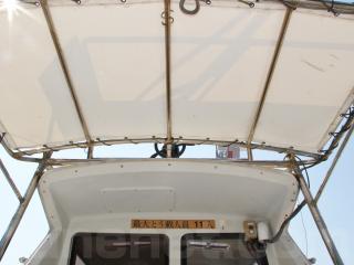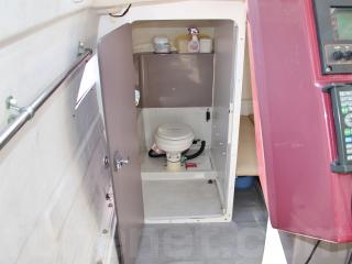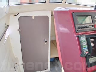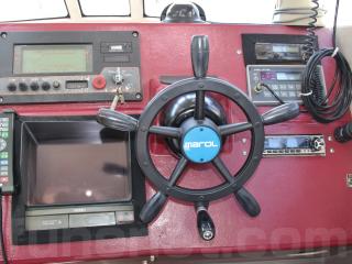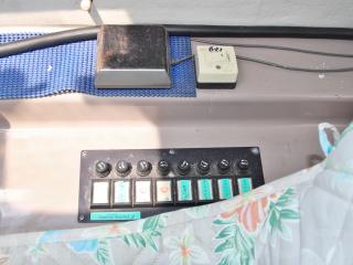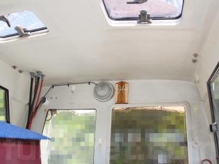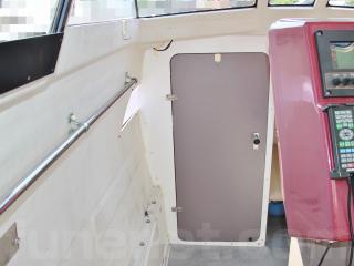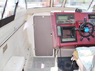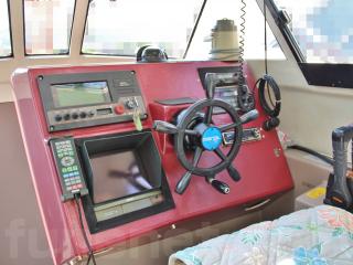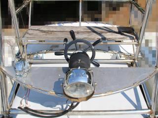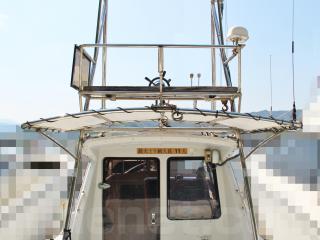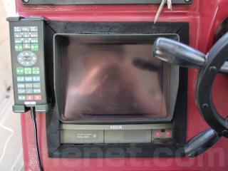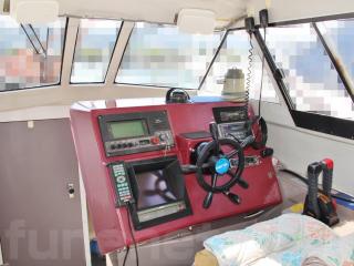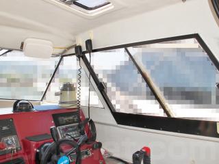 ◆コクピットからの見切りは良好です。コクピットにはGPS魚探、アマチュア無線機、1W漁業無線機、コンパス、オーディオデッキ、DC-DCコンバーターなどが装備されています。なお、取材時にGPS魚探に電源が入る事は確認いたしましたが、無線機類に電源は入りませんでした。(原因が本体なのかヒューズ等なのかは未確認です。)