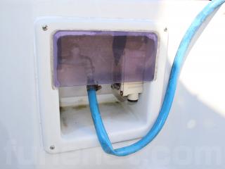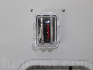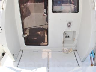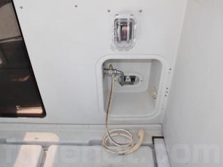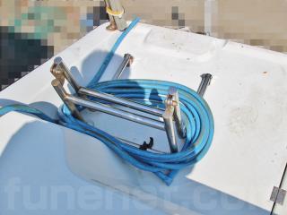 ◆アフトデッキ(リア)には電動リール電源、陸電コンセント、清水シャワー、デッキウオッシュ、イケスも備わっています。また、トランサム部には大きなステップとラダーもついていますので、沖で船尾から大きな波が来ても安心感は高いと思われます。