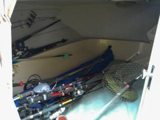 前方バースはカーテンで仕切られており、ちょっとしたプライベート感もあります。写真にある釣具は売却時には降ろしますので付属していません。