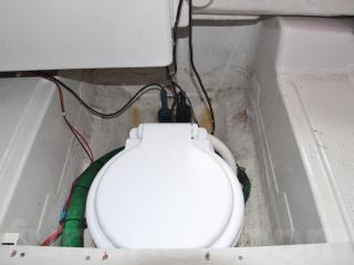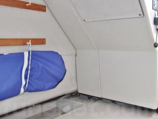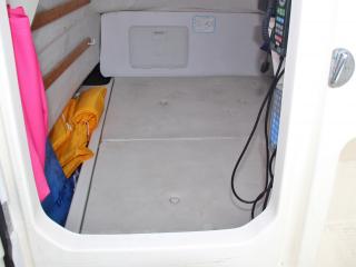◆キャビンスペースに入ると(写真No,16~)白い3分割のボードクッションがあり、その下に電動マリントイレが装備されています。また魚探の振動子もキャビンスペースにあります。マリントイレももしご試乗に来ていただけるのでございましたら海上での動作確認をお勧め致します。